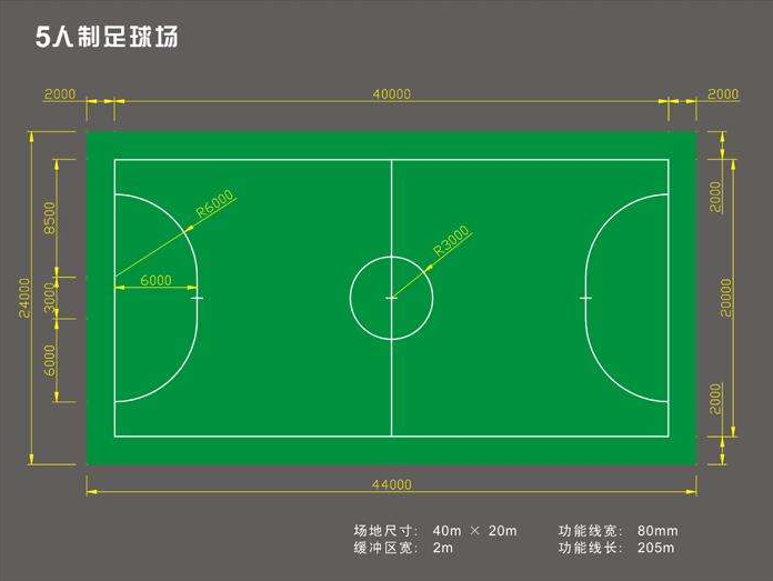 以上為標(biāo)準(zhǔn)5人制足球場尺寸參考尺寸,實(shí)際場地可根據(jù)當(dāng)?shù)厍闆r因地制宜