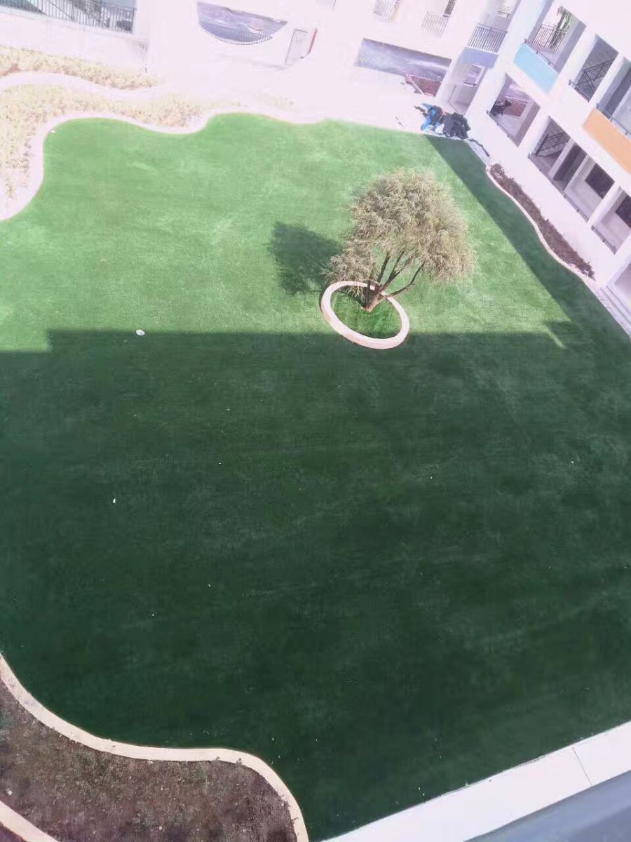 因為這個綠化場地是異形的需要定制,所以選擇鋪裝人造草坪也會相對比較簡單,人造草坪具備的其中一個優(yōu)點就是可以根據(jù)場地定制設(shè)計然后鋪裝出來,效果也是很好的,可以看下面的施工完成圖。